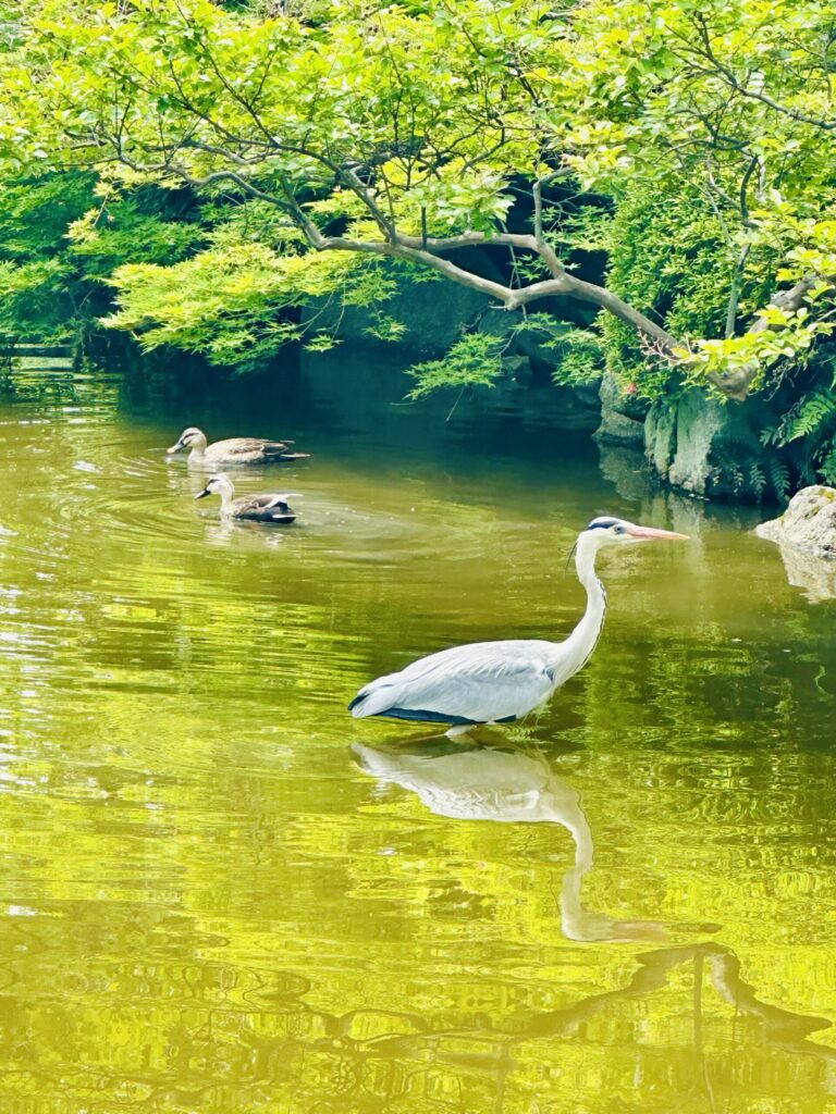 池の水面には新緑が映り、まるで一枚の絵画のような景色🦆